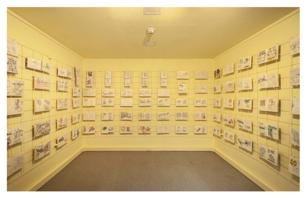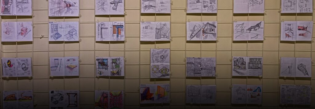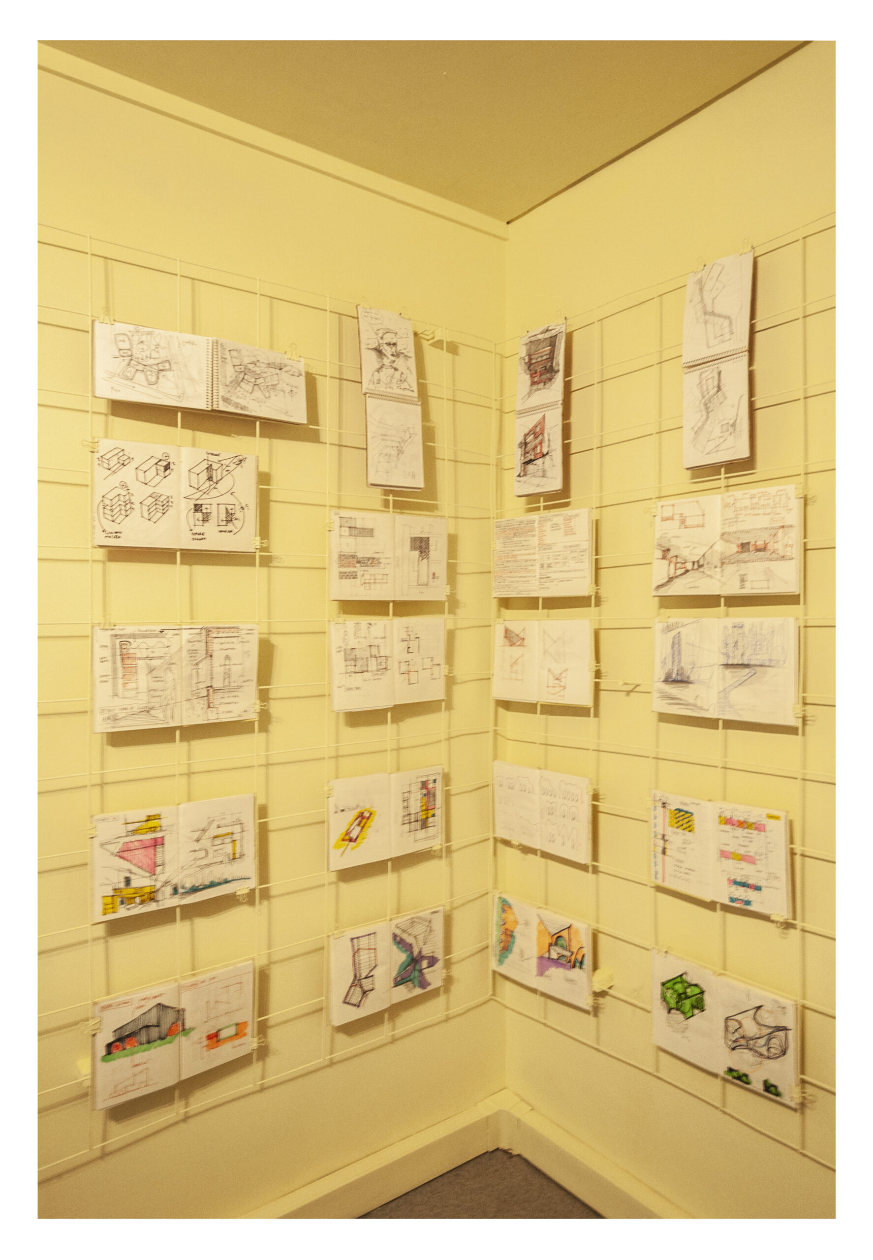 En la muestra hay mucho para ver, porque son cosas muy variadas. Hay mucha improvisación gráfica, cosas aleatorias, dibujos sueltos, y mucho de arquitectura que están ahí en forma de bocetos con el anhelo de poder materializarlos. Y lo que veo en esas hojas son algunas cosas que aparecen como errores, pero que son parte de mi camino profesional y personal.