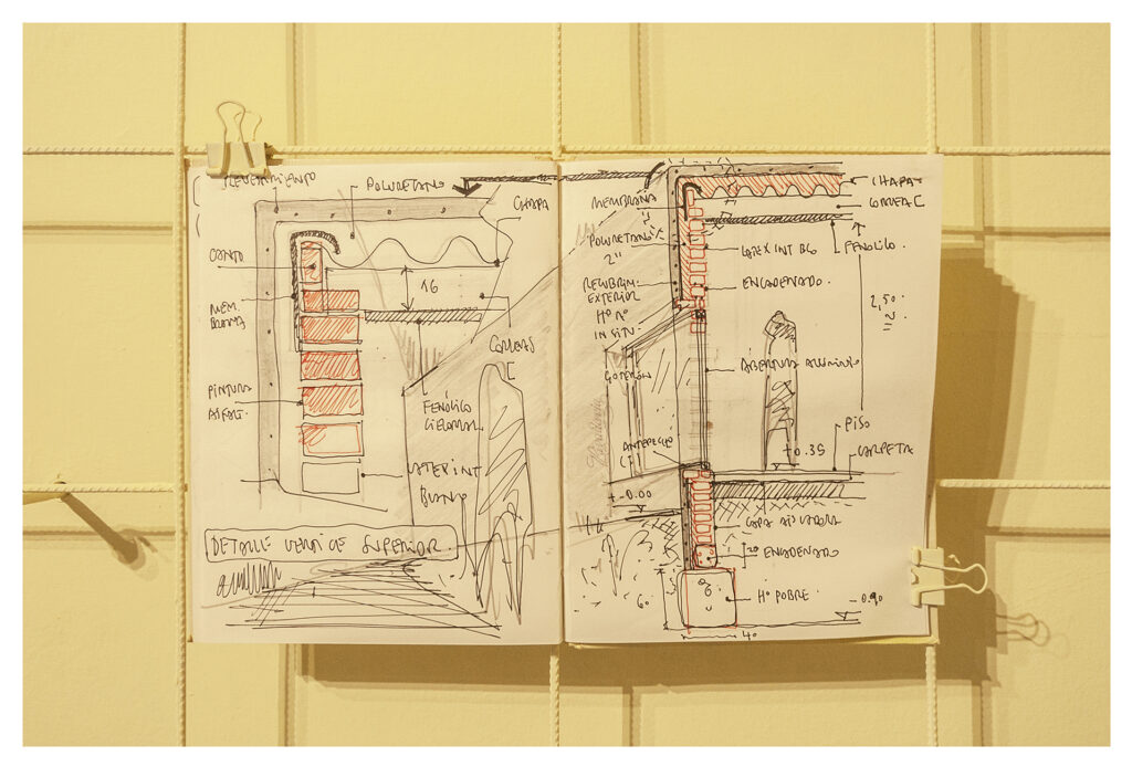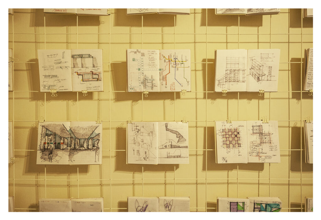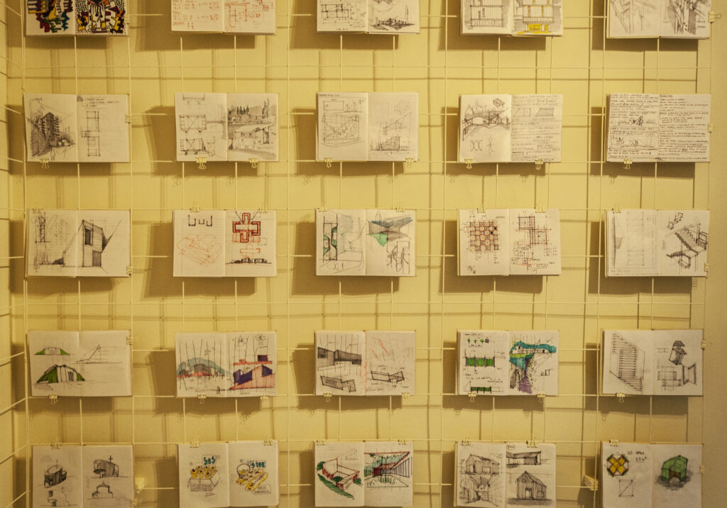 Con sus hojas abiertas al público, quienes visitan la muestra pueden detenerse a observar dibujos, croquis, bocetos, y anotaciones personales que este arquitecto realizó desde el 2006 hasta la irrupción de la pandemia del Covid en 2020.