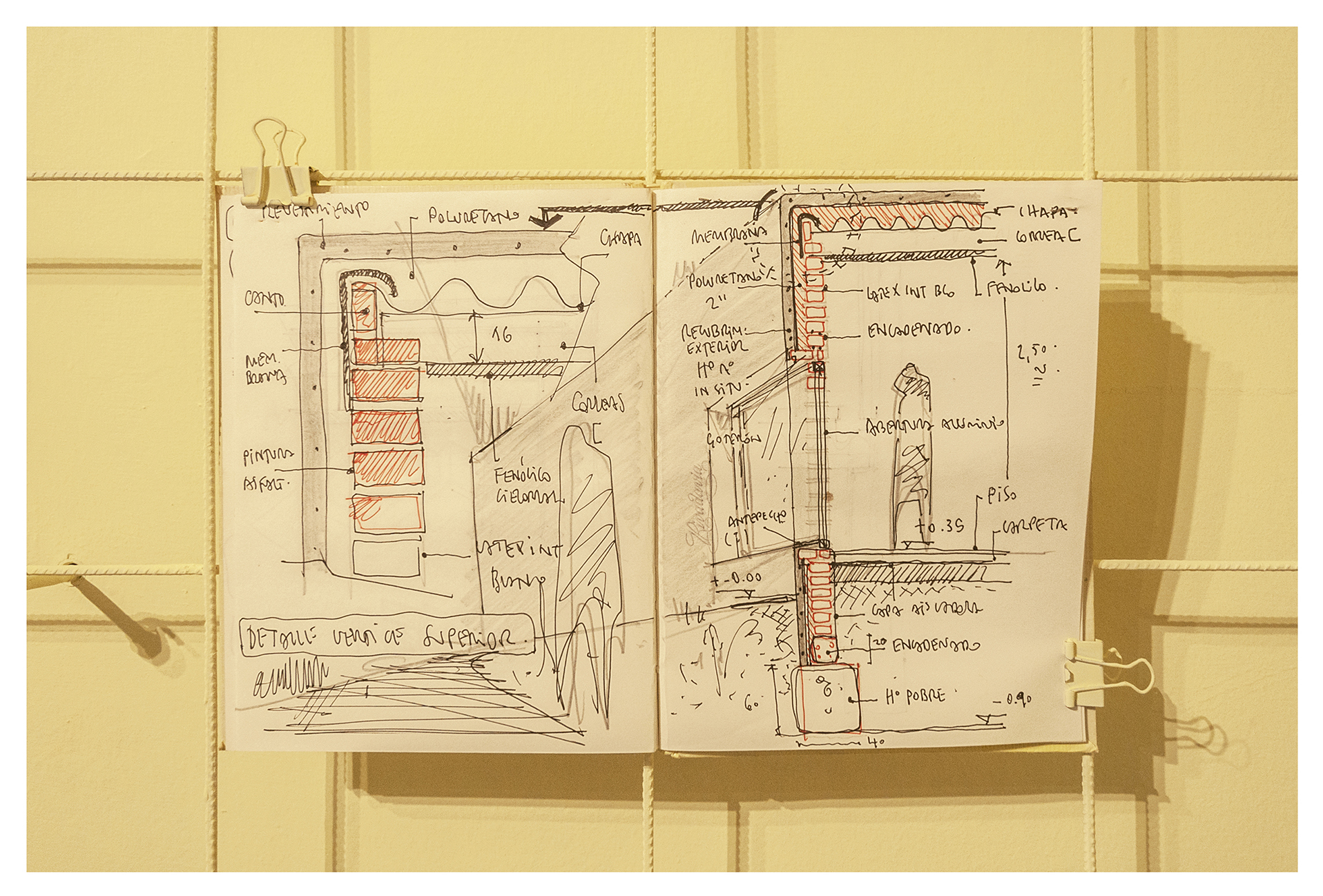 Lo que hay en esas hojas, la matriz principal, es el registro de mi quehacer como arquitecto, mis ideas, croquis. Es una herramienta que utilizo para dibujar. Yo soy de los arquitectos que dibujan mucho. Dibujo a mano, en distintas escalas; desde bocetos o cosas preliminares y abstractas hasta desarrollos de detalles.